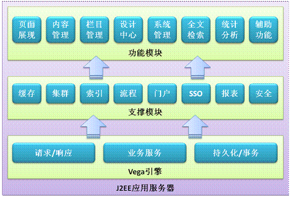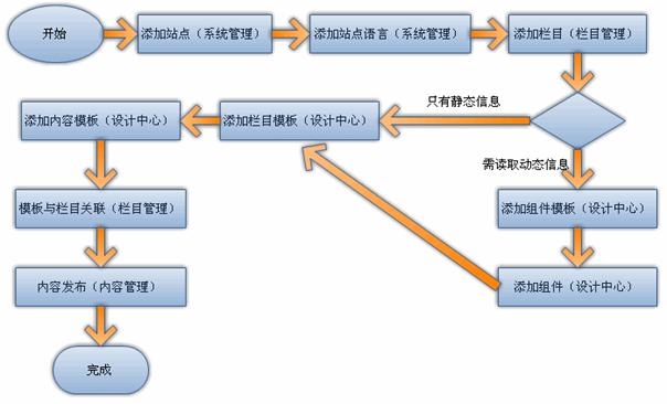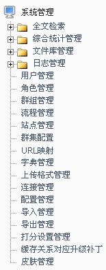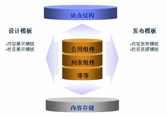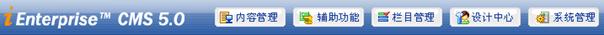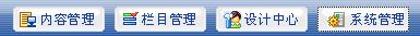 内容管理供内容发布使用,栏目管理提供对栏目节点的管理,设计中心提供对模板,组件的管理,辅助管理提供对交互性内容的管理(留言板、广告管理以及调查功能),系统管理提供安全,统计,工作流,站点等的管理。
