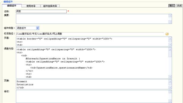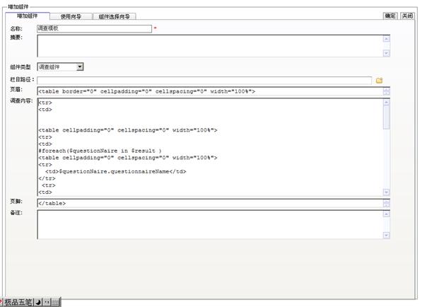 2、 在“设计中心”下的“系统公用组件”,点击“添加”,选择组件类型为“调查组件”。按下图所示填入组件中各项,代码可参考本手册5.4章节。