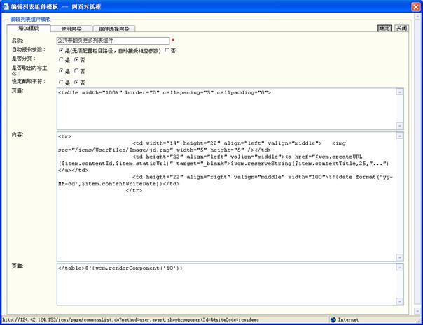 l 发布类模板:用来定义内容组织的数据元素,例如一条典型的新闻由新闻标题,新闻发布时间,新闻作者,新闻内容等数据元素构成。发布类模板的作用就是灵活定义内容数据元素构成。在本系统中有两种类型的发布类模板:内容发布模板及栏目资源模板。